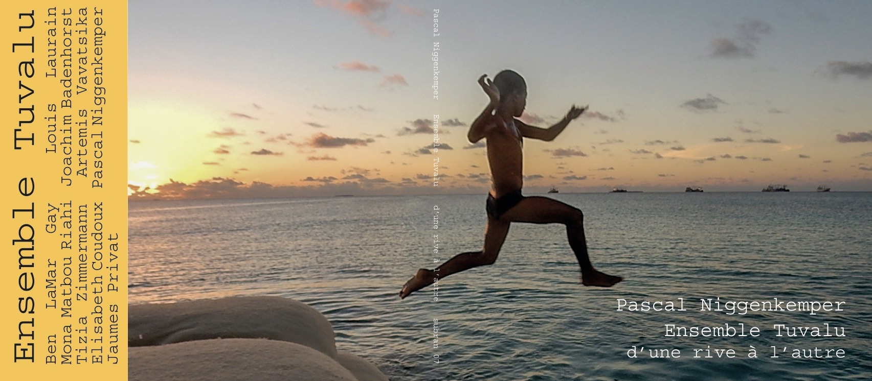 Partant de cette réalité, Pascal a formé l’ensemble Tuvalu avec l’intention de questionner la relation humaine à la nature en utilisant des textes et des poèmes scandés dans les langues maternelles de chaque membre de l’ensemble : français, flamand, grec, anglais, farsi, allemand et occitan.