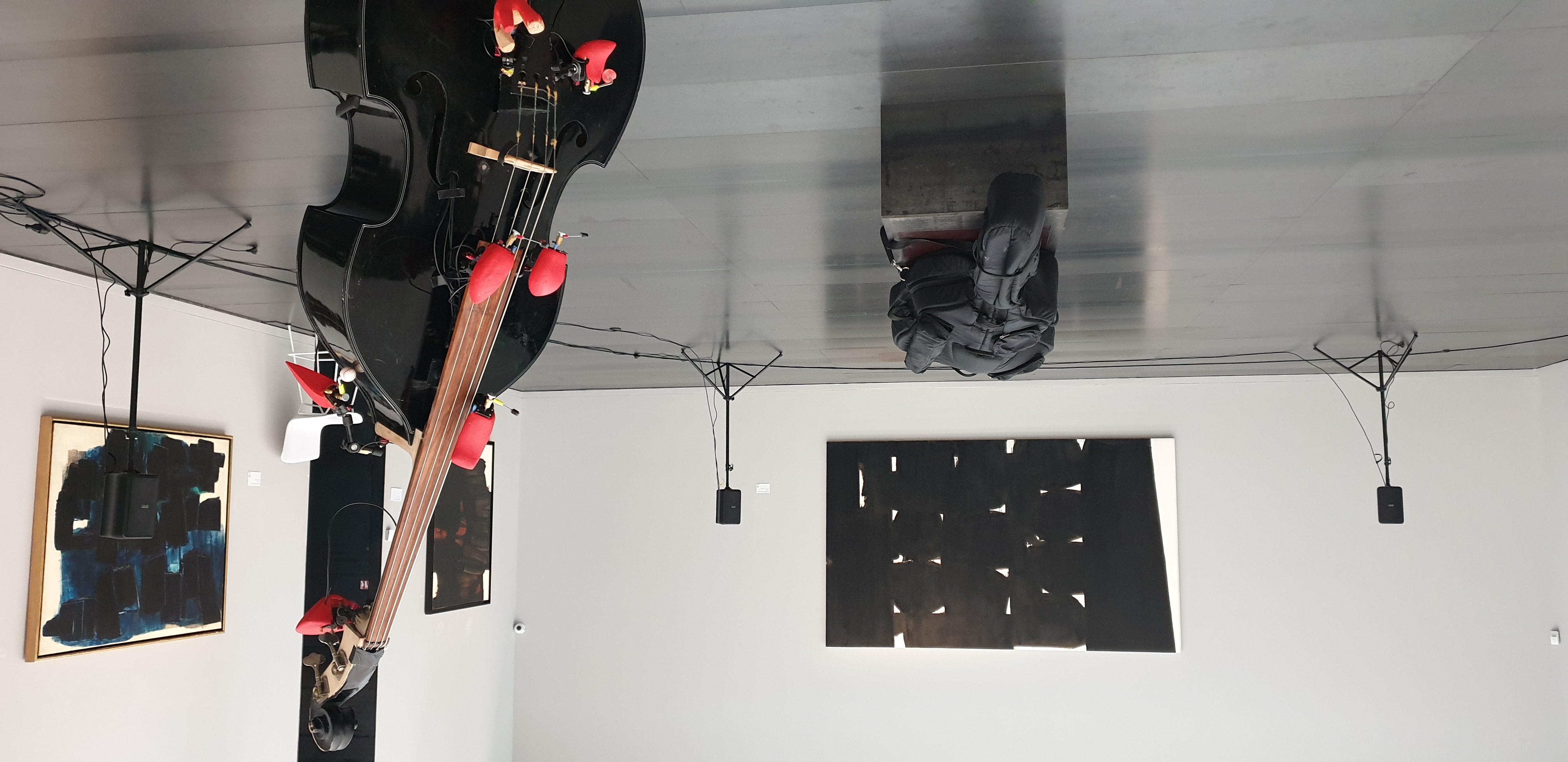 L'installation en octophonie donne la sensation de voyager à l'intérieur de la contrebasse augmentée.